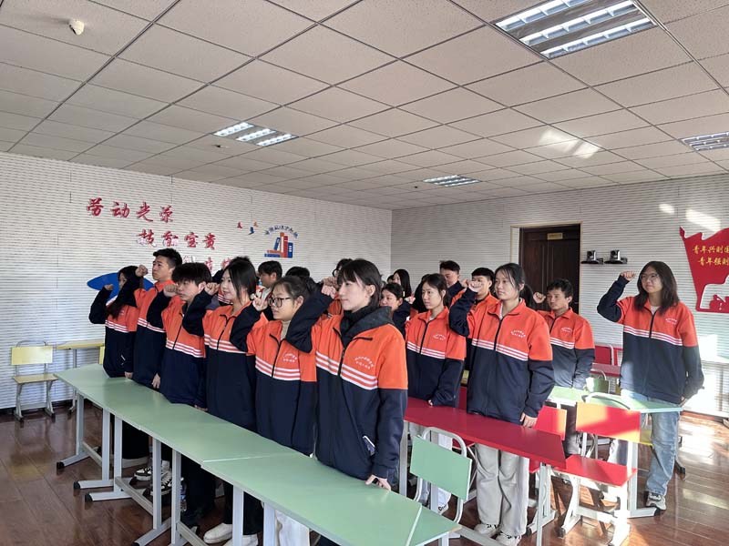 互动环节中,团员踊跃分享感悟。2023级李同学表示,通过此次团课学习,明晰了国家公祭日“铭记历史、警示未来”的核心意义;另有团员提出,新时代青年技工应兼具技能本领与家国大义,引发全场共鸣。活动尾声,全体团员面向国旗庄严宣誓,彰显报效祖国的坚定决心。