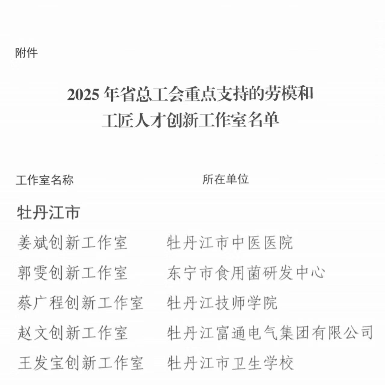 10月29日,黑龙江省总工会发布了《关于2025年黑龙江省总工会重点支持的劳模和工匠人才创新工作室的通报》,我院蔡广程创新工作室成功入选。