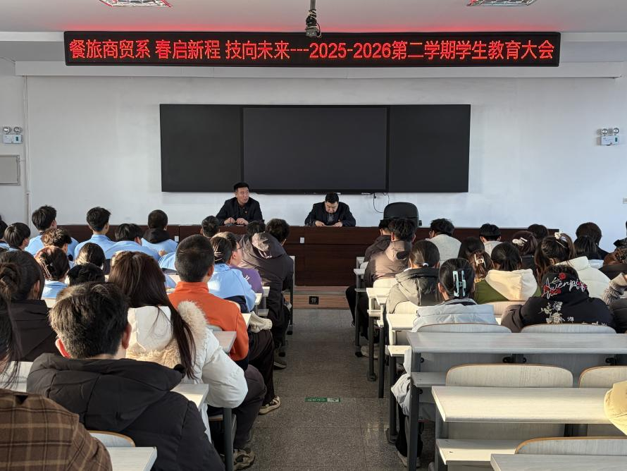 春回大地,万象更新。2026年3月5日下午,餐旅商贸系“春启新程,技向未来”新学期全体学生大会于牡丹江技师学院主楼七楼会议室召开。系教学主任付文龙、学管主任张忠金出席,全体班主任以及全系学生共同参加了此次会议。