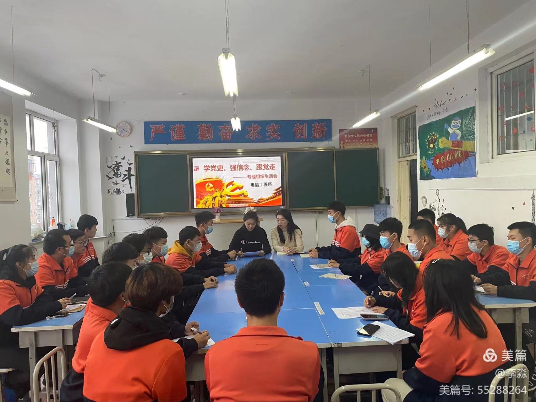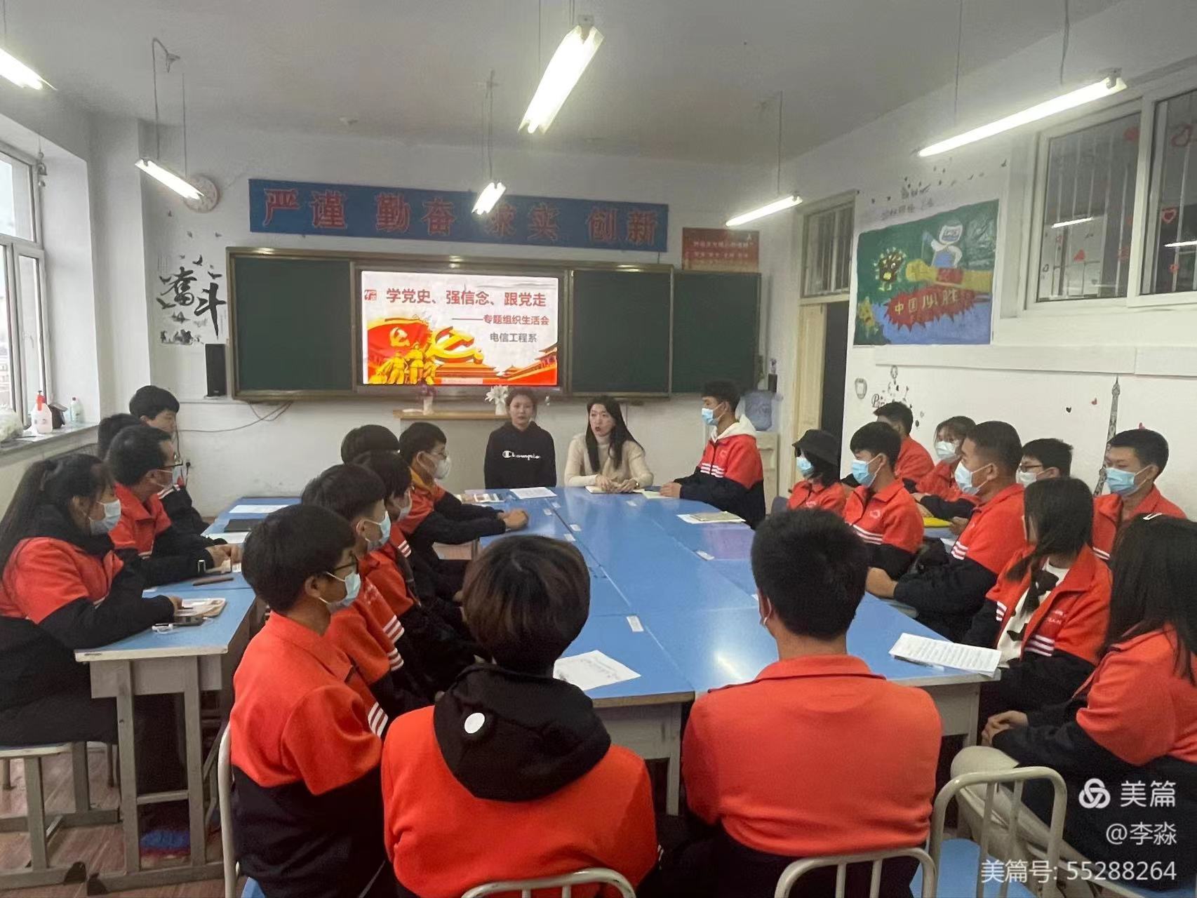 为深入学习贯彻习近平总书记“七一”重要讲话精神,落实“学史明理、学史增信、学史崇德、学史力行”要求,紧密联系团员思想学习工作实际,交流学习体会,对标新进标准、查找差距不足、激发责任担当,教育引导广大团员厚植爱党、爱国、爱社会主义的情感,树立远大理想,增强奋斗精神,争当中华民族伟大复兴的生力军。电信工程系团总支于2021年11月23日15点20分在主楼S402举行“学党史、强信念、跟党走”专题组织生活会。参加本次会议的有:电信工程系副主任乔希、团支部书记李淼及各个团支部的团员。