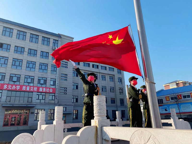 国旗护卫队的队员,迎着朝阳,伴着雄壮的《义勇军进行曲》,五星红旗冉冉升起,全体师生向国旗行注目礼,升旗仪式庄严隆重。