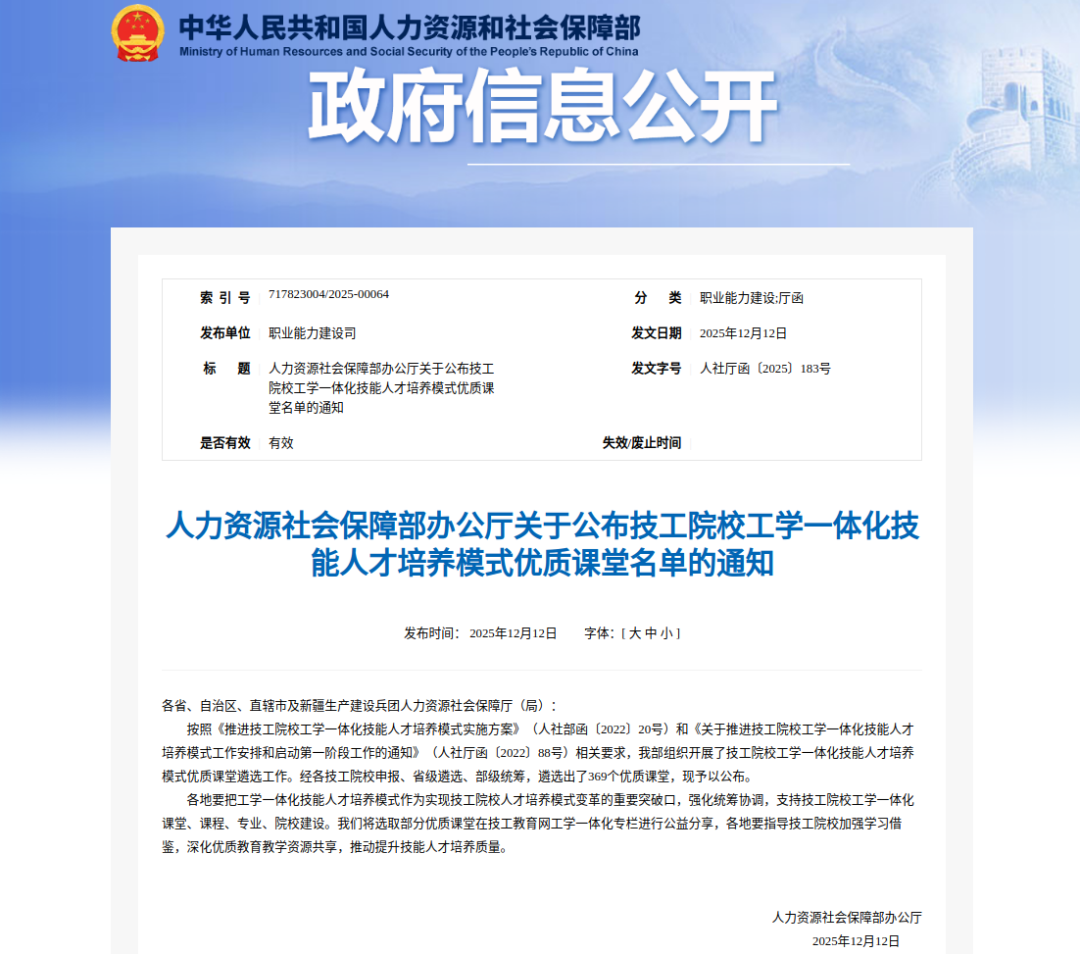 “十四五”以来,人力资源社会保障部大力推行技工院校工学一体化技能人才培养模式改革,并于近期在全国范围内组织评选,共遴选出215所技工院校的369门优质课堂。在此次评选中,我院申报的两门课程凭借扎实的教学基础、鲜明的工学一体化特色和突出的实践成效,成功入选全国优质课堂名单。具体如下: