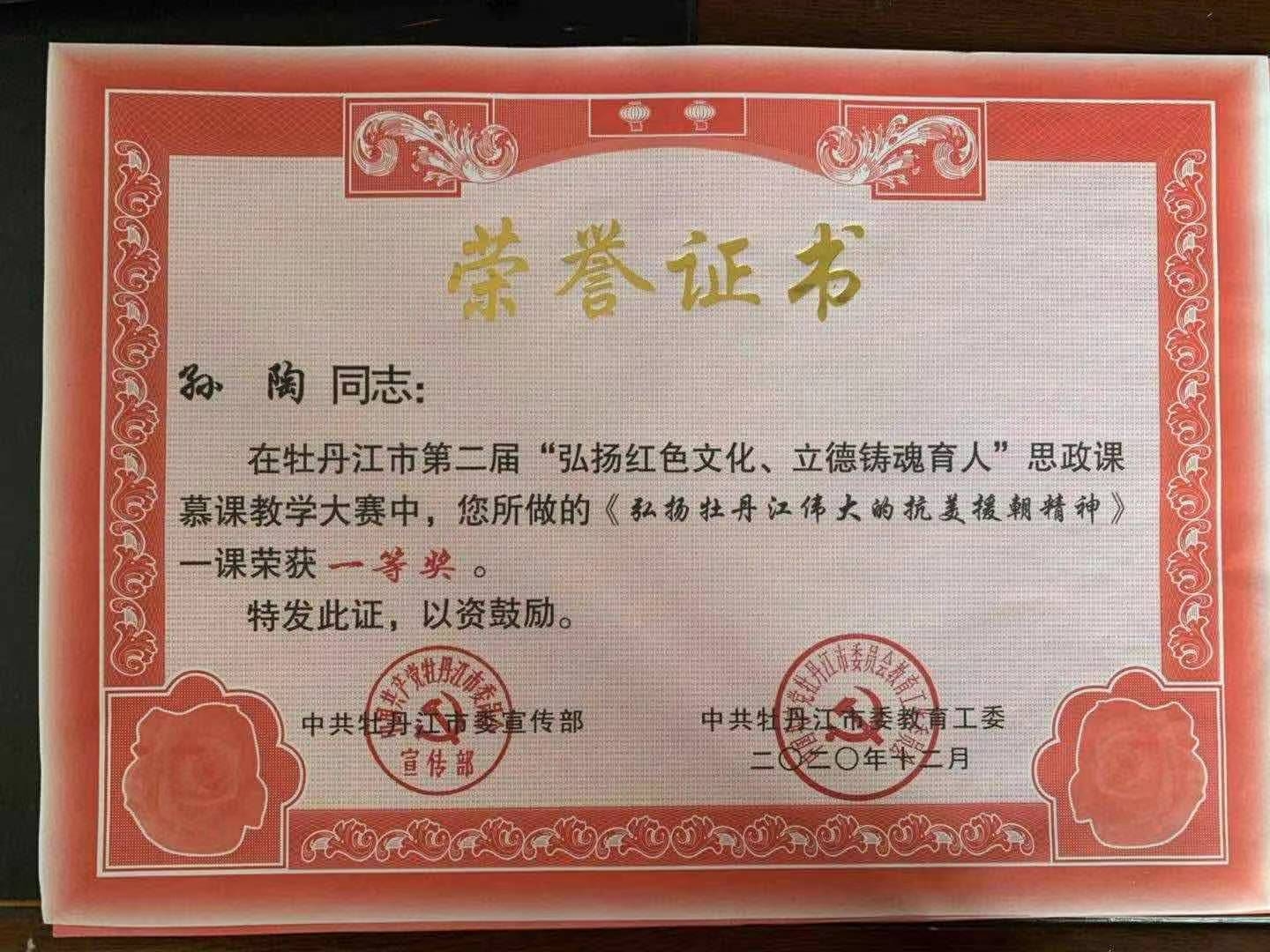 2020年12月我院思政教师在牡丹江市第二届“弘扬红色文化、立德铸魂育人”思政课慕课教学大赛中表现突出,荣获高校组优异的成绩。